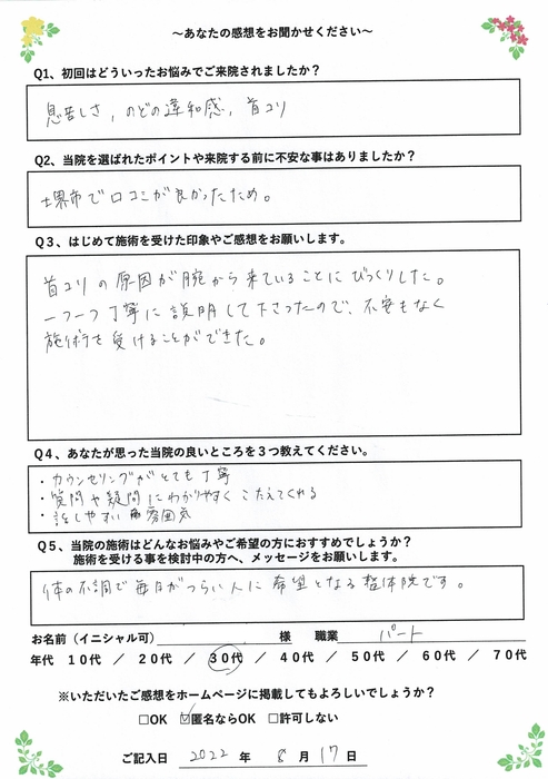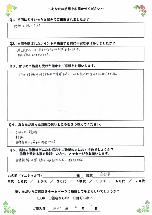 今回、自律神経整体お試しキャンペーンをご利用いただいた、2名の初回アンケートをご紹介いたします。