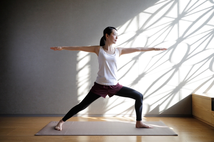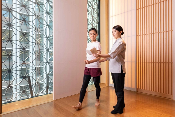 体幹を調えた翌朝には、星のや東京のスタッフと、深呼吸のリズムに合わせてストレッチを行います。爽やかな柑橘の香りが漂う空間で、肺を大きく開くようにイメージをしながら、身体の隅々にまで空気を行き渡らせます。呼吸を調え、肺いっぱいに空気を取り込むことで、肺機能と呼吸に関わる筋肉を刺激し強化します。(*5)また、ゆっくりとした深い呼吸は、副交感神経を刺激するため、血流がよくなり、筋肉が弛緩して体の冷えを解消すると言われています。(*6)