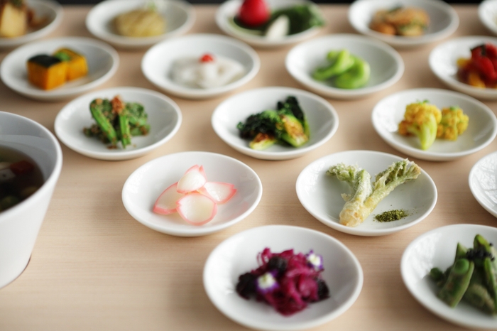 2日目の昼食には30種類以上の季節の野菜を用いて作る小皿と、生姜を使ったスープのランチを提供します。素材の味、香り、彩りや食感に意識を集中させ、一皿ずつ五感を研ぎ澄ませながら味わいます。