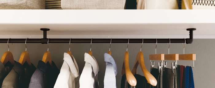 ハンギングバーH-3は、棚板にも取付けられるボルト止め対応のブラケットを採用。許容荷重30kg対応で洋服の多いクローゼットでも安心して設置可能です。カラーラインナップにはグレーを追加するなど、よりご提案していただきやすい品揃えになりました。