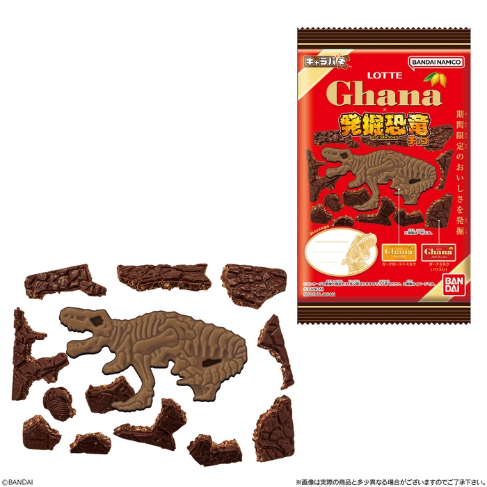 株式会社バンダイ キャンディ事業部では、板型チョコレートをパキパキ割って恐竜のチョコを型抜く「キャラパキ発掘恐竜チョコ」と、発売60周年を迎えるロングセラーブランドの「ガーナ」がコラボレーションした『キャラパキ発掘恐竜チョコ ガーナコラボver.』(税込108円)を2024年12月23日(月)より順次、全国量販店のお菓子売り場にて販売開始いたします。