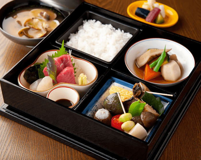 鮮魚のお造りに煮魚や野菜の炊き合わせなど、旬の味覚を少しずつ詰め合わせた豪華弁当には、しじみがたっぷり入ったしじみ汁がついています。
