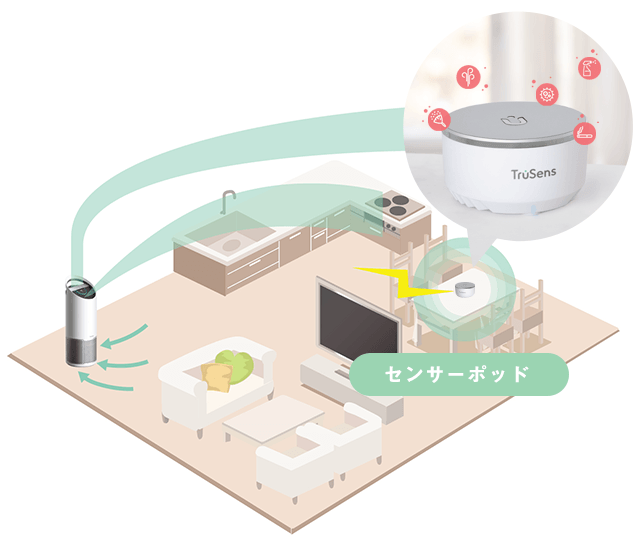 TruSens空気清浄機シリーズの最大の特徴は「センサーポッド」というリモートセンサー。空気清浄機から離れた場所に置いて空気の状態を測定でき、測定結果は数値化され本体のディスプレイに表示されるので、空気の「きれい」が可視化され目で見て効果を実感できます。お部屋の隅に置いた空気清浄機の周辺だけがきれいになっているのではなくセンサーポッドを置いた場所の空気がきれいになるまで最適な風量で清浄し続けます。
