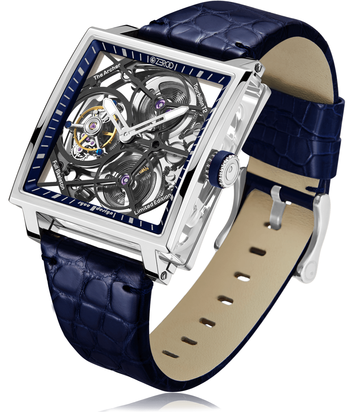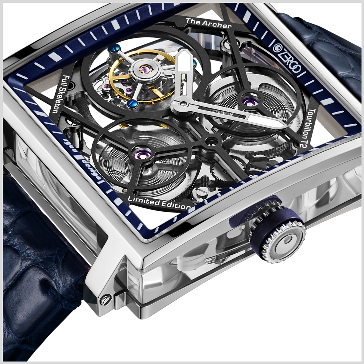 一般的なトゥールビヨンは機構のほとんどがプレートで覆われており、内部の精密機構の動きまでは楽しめませんでした。ZEROO THE ARCHERは、スケルトンのトゥールビヨン・ムーブメントを独自に開発したスケルトンケースに収めることで、全方向からの観賞と、全方向からの光を取り込むことに成功し、これまでにない透明感あるフルスケルトンのトゥールビヨン腕時計を誕生させました。