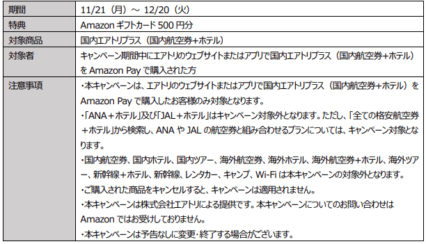 ~国内エアトリプラス(国内航空券+ホテル)を Amazon Pay で購入した 方もれなく全員に Amazon ギフトカード 500 円分をプレゼント~