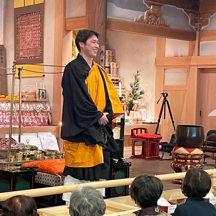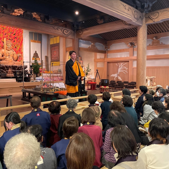 この2日間清浄心院の氏神様3体(大黒天・弁財天・稲荷大明神)を御開帳し、住職 池口恵観による「家門繁栄・商売繁盛祈願」特別護摩行祈願をおこないました。初日には、約20名の高野山僧侶と新井貴浩元プロ野球選手にも登壇いただき、護摩業の後に新井様より、これまでの池口住職との出会いや修行についてお話しいただきました。