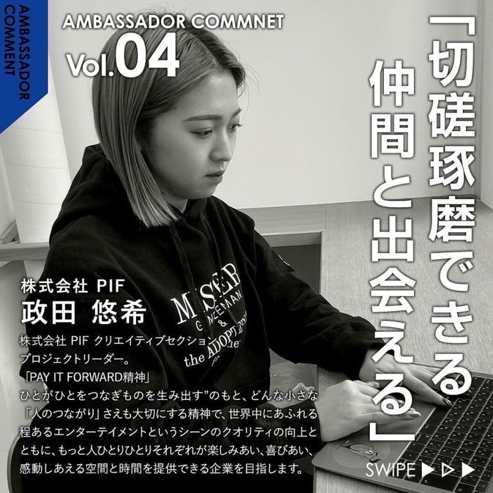 Voice Entertainment Academyご開校おめでとうございます!アンバサダーを務めさせていただくことになりました、株式会社PIFの政田 悠希です。人前に立つと言うことは、人間としての魅力が必要だと思います。努力が出来ない人は、何も成し遂げることはできません。本当に好きなことだからこそ、熱意をもって努力できると常々思っています。仲間達と切磋琢磨しながら、自分のなりたい道へ向かって突き進んでください!いつでも応援しています!