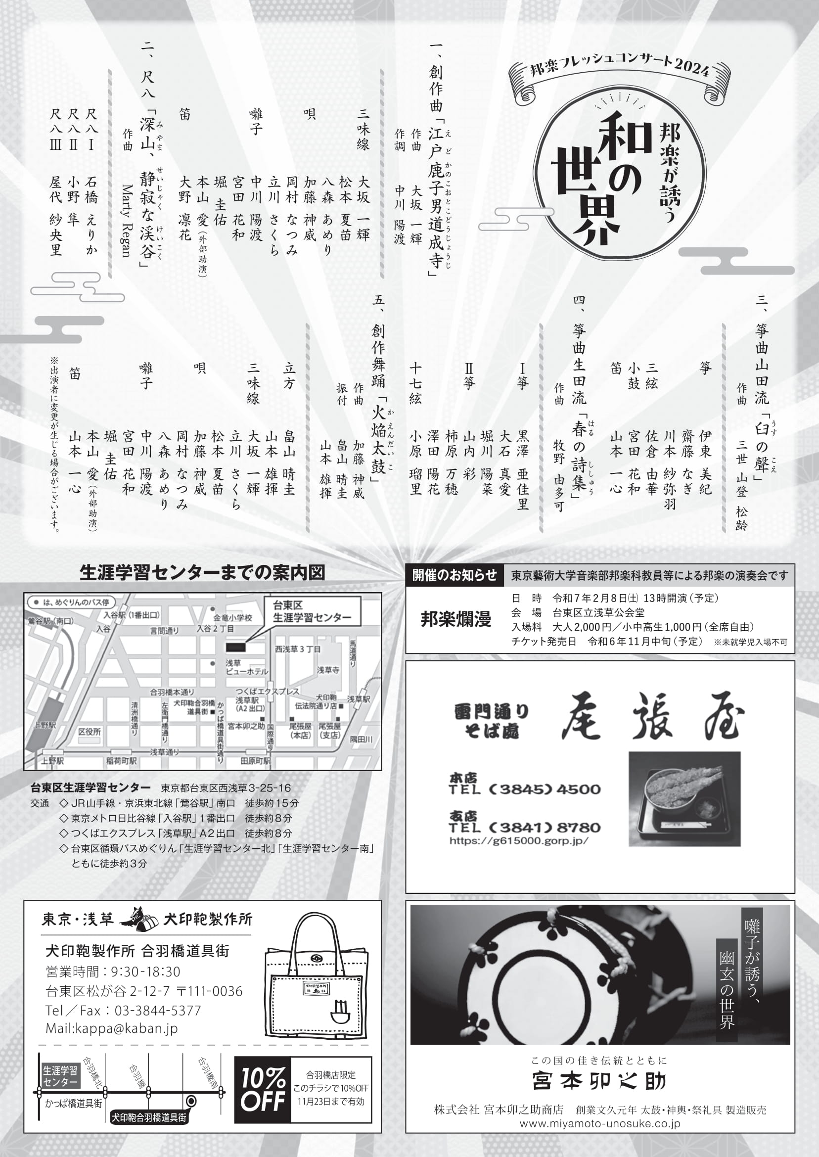(公財)台東区芸術文化財団主催、『邦楽フレッシュコンサート2024 ~邦楽が誘う和の世界~』が2024年10月19日 (土)に台東区生涯学習センター・ミレニアムホール(東京都 台東区 西浅草 3-25-16)にて開催されます。