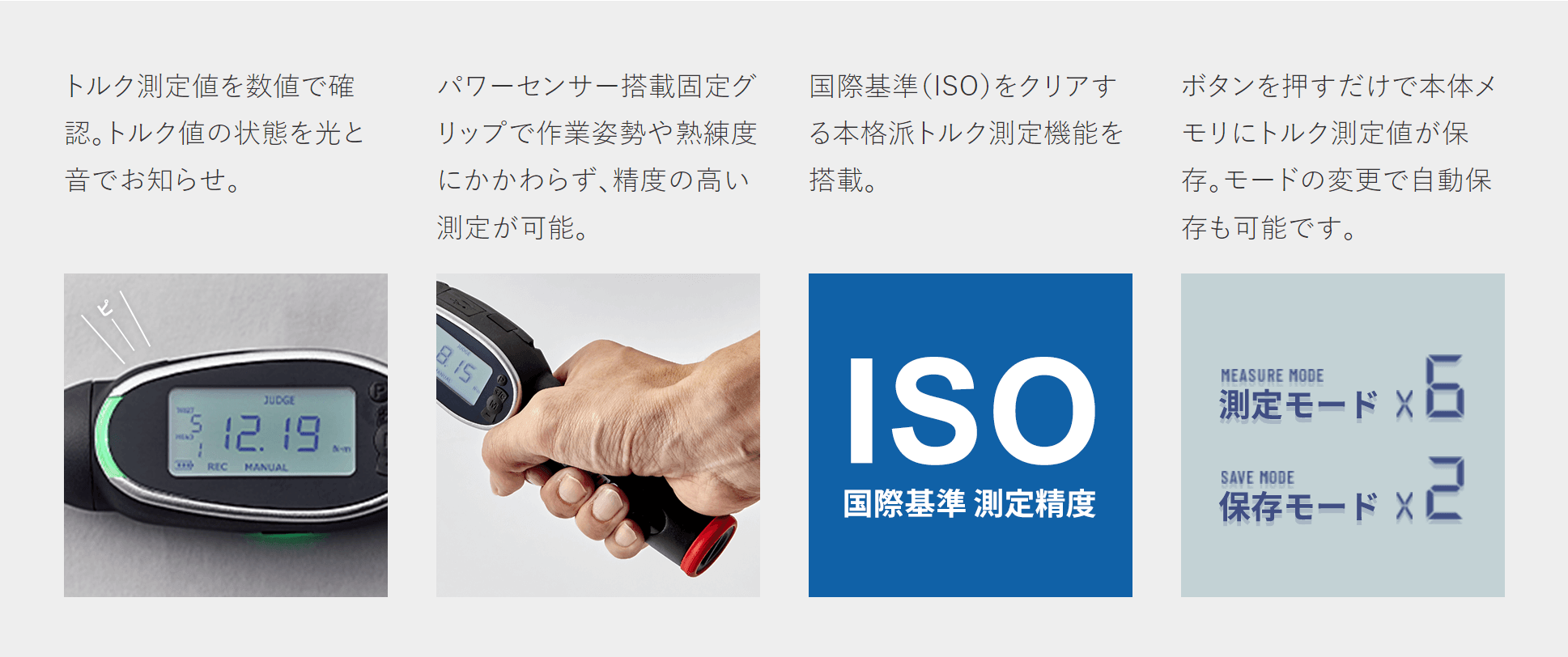 デジラチェは、光と音に加え振動でも目標トルク値に達したことを伝え、正確なトルク測定ができるデジタル式トルクレンチです。トルク値が一目でわかる3個所のLEDライトと、暗い環境でも作業しやすいバックライトを新たに搭載。