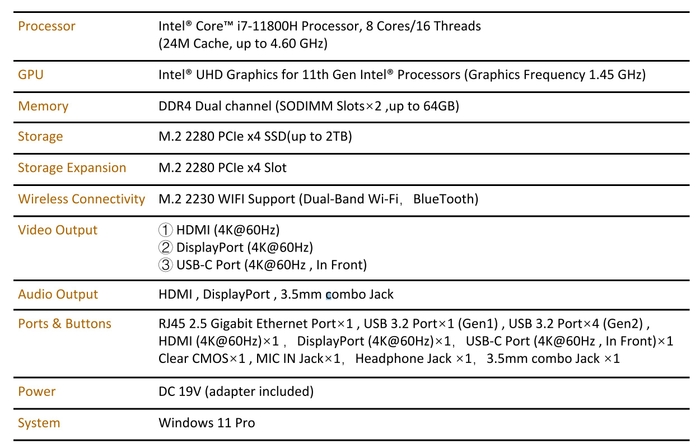 昨今のコロナ禍でご自宅で仕事や副職をされる方々、ワーケーションで持ち運べる省スペースで省エネなミニPCが人気になっていますが、本モデルはMac miniより小さい薄型筐体にIntel 第11世代のCore i7-11800HのハイパフォーマンスCPUを搭載し、最大3モニター/4K@60Hzで表示可能。小さな筐体にデスクトップPC並みの64GBの大容量メモリーや、M2.SSD(PCIe 3.0/4.0両用)を2スロット搭載可能です。一時的なワーケーション先、仕事や副業・趣味など様々な用途で活用できる、省エネでコストパフォーマンス良い新世代ミニPCです。 ベアボーンモデルなので、ご自身でお好きなメモリーとストレージを組み込めます。 Windows 11 Pro DSP版ライセンスと ロジクール マウス キーボード セット MK245nBKが付属しています。