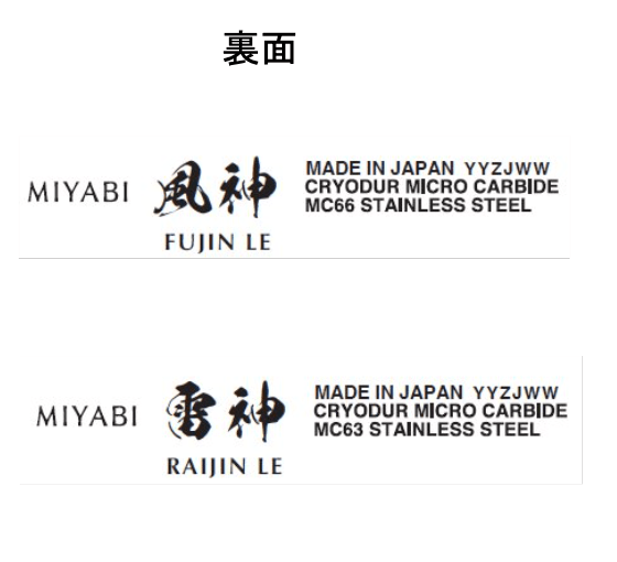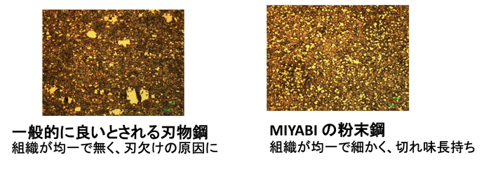 「粉末冶金法」という、文字通り粉末状の金属に熱と圧力を加えて成形する事で、高い硬度、均一で細かい金属組織を与えます。「風神」に使用されるMC66はMIYABI最上位の硬度HRC66を誇り、切れ味が長く続きます。「雷神」のMC63は、適度な靭性、サビ耐性、HRC63という炭素鋼を超える高い硬度が特徴です。両鋼材の組織が非常に細かいおかげで、関の職人の「本刃付け」の仕上がりもより鋭く、極上の切れ味に繋がります。