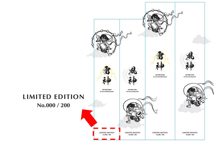 天然素材のハンドルも、美しいダマスカス模様や槌目加工も、一つとして同じものはありません。一本一本、130を超える工程を経て完成したMIYABIの包丁は、その全てが一点物です。「風神」と「雷神」は、それをハイライトするため、個装箱のスリーブ及び同封されたステッカーにシリアル番号を印字しています。また、梱包箱のデザインは、「風神」「雷神」すべてを揃えると繋がり、一つの絵となります。