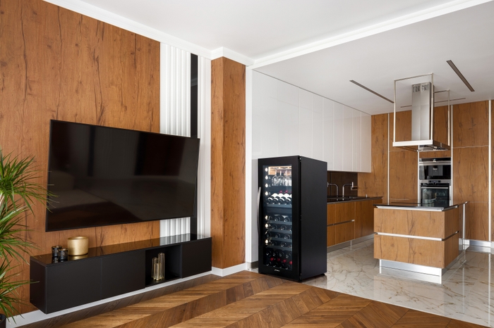 上部コンパートメントにはワイングラスを収納するグラスシェルフ、ボトルを斜め置きに収納し魅せる収納が可能なスラントディスプレイシェルフを装備。下部コンパートメントにはワイドに引き出すことができ、ボトルをスムーズに出し入れできるイージーピックアップ スライドシェルフを配しています。
