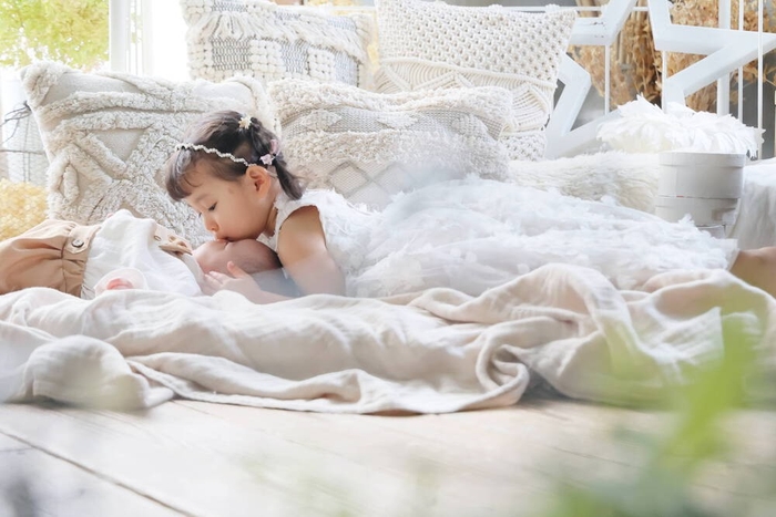 3歳ほどのお姉ちゃんは、自分もまだ遊びたい盛り。 それなのにこちらがお願いしたことは完璧にこなしてくれて、 弟くんに優しく触れる姿は、既にしっかりとしたお姉さんでした。 上から入ればくっきり。 下の方から入ればふんわりとした雰囲気で撮影ができるこの部屋。 それを上手く使い分けながら撮影をしていきます。 どの写真をどんな雰囲気で残すかは人それぞれの好みですが、 見た人にどういう写真を残したかったのかを伝える力は、 その人の表現力にかかっていると思います。 赤ちゃんの柔らかい雰囲気と、 お姉ちゃんの優しさを上手くまとめてくれる白い自然光。 健やかなイメージを与えてくれる緑もしっかり入れて、 奥行きを出しながら視線が2人へ向くようにしました。 こちらが何も言わなくてもお姉ちゃんは赤ちゃんを見てくれます。 そしてずっと頭に触れていてくれました。 そんな暖かい空間がしっかりと伝わる写真になっていればいいなと思います。
