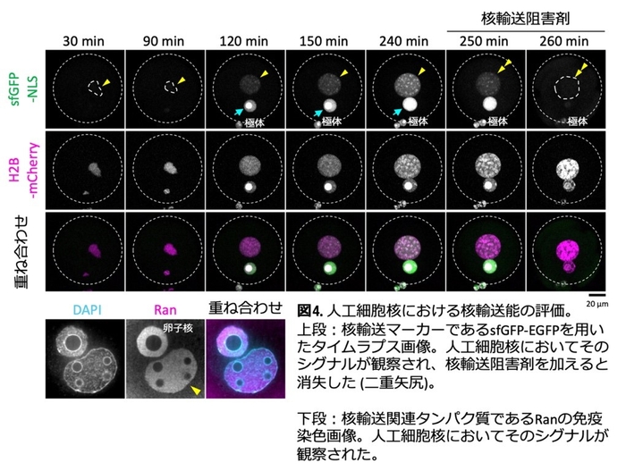 最後に、作製した人工細胞核が核輸送能力を持っているか確認するために、蛍光タンパク質を付加した核局在化シグナル(NLS)※7 が人工細胞核に入るかどうかを観察しました。その結果、蛍光タンパク質が人工細胞核内に流入することが確認されました。この蛍光タンパク質が取り込まれた人工細胞核に対して、核輸送阻害剤であるimportazoleを添加したところ、蛍光タンパク質が流出することが観察されました(図4上段)。さらに、核輸送に関与する因子として知られるRanというタンパク質が人工細胞核に存在していたことから(図4下段)、研究グループは、核輸送能力を有する人工細胞核を構築できたと結論づけました。
