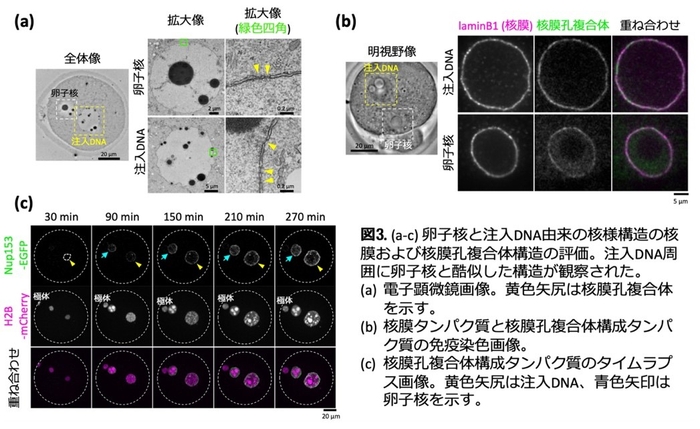 DNA溶液を注入した胚を観察した結果、注入したDNAがヌクレオソーム構造※4 を形成していること、注入したDNAの周囲に本物の核と似た核膜と核膜孔複合体ができていること、そして、核として必要な物質輸送能力があることなどを確認できました。また、ライブセルイメージングで観察したところ、注入したDNAが核膜孔複合体を獲得する様子を世界で初めて捉えました。