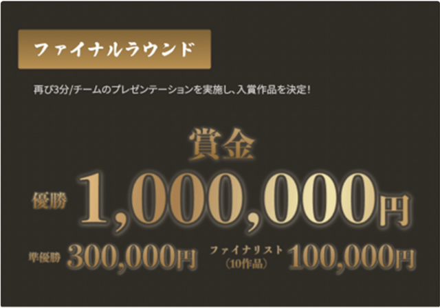 スポンサー企業からのサポートにより、決勝大会参加者には開催会場までの交通費が支給されます。さらに、優勝者には賞金100万円、準優勝には賞金30万円、ファイナリスト10組には賞金10万円が贈呈されます。