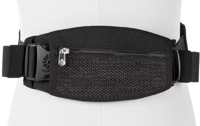 ウエストベルト背部にファスナー付きのポケット(約15x12cm)。小物を入れられるので、おでかけ時に重宝します。