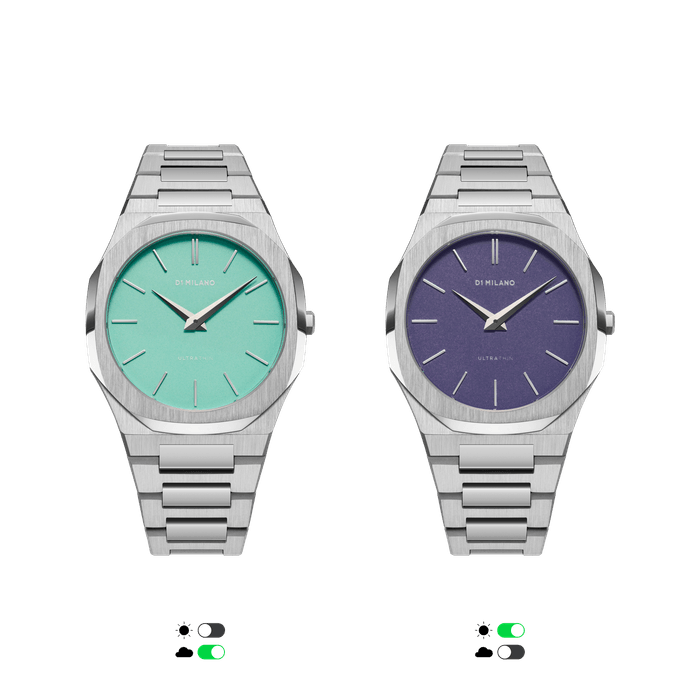この革新的なモデルは、太陽光(紫外線)に反応して文字盤の色が変化する特別なギミックを搭載。D1 MILANOにとって初の試みとなるこのデザインは、ひとつの時計で二つの表情を楽しむことができる、ユニークで遊び心あふれるタイムピースです。