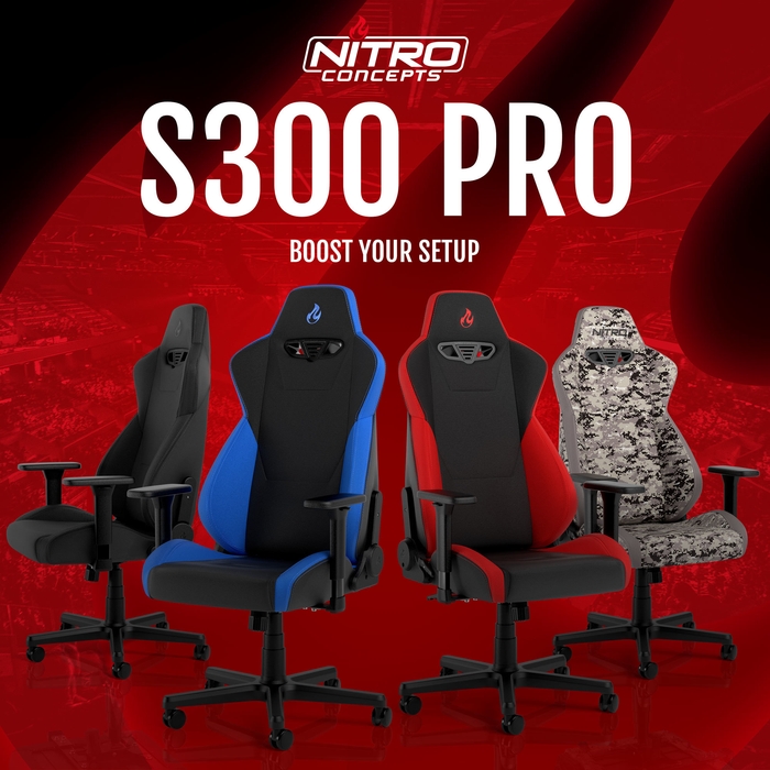 noblechairsの姉妹ブランドとして、低価格ながら高品質、スポーティーなデザインが特長のNitro Concepts。この度、本ブランドの主力モデルである「S300」を部品改良したリニューアルモデル「S300 PRO」を発売いたします。極厚クッション・ファブリック張りのゲーミングチェアとして長らく定番化していたS300が、日本向け仕様になりこれまで以上にフィット感の高い、高コストパフォーマンスのチェアとして生まれ変わりました。