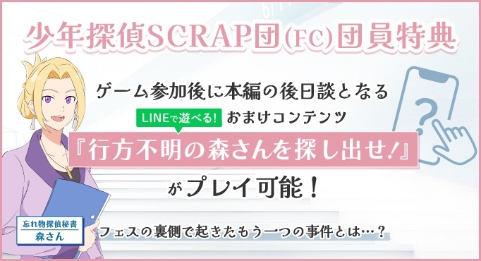 SCRAP公式ファンクラブである少年探偵SCRAP団の団員は、ゲーム参加後に本編の後日談となるおまけコンテンツ『行方不明の森さんを探し出せ!』がプレイ可能。忘れ物探偵秘書の森さんとあなたの物語をお楽しみいただけます。