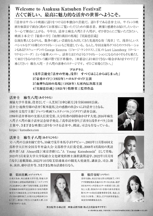 株式会社あそう活弁(埼玉県草加市)主催、『浅草活弁祭り2022』が2022年10月29日(土)に浅草東洋館(浅草演芸ホール4F)(東京都台東区浅草1-43-12 浅草六区交番前)にて開催されます。