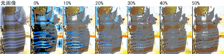 ![図2 DNNモデルの機械学習[4]時にブルー・バイアス画像を混ぜて比率を変えたモデルに対し、#TheDress画像でテストした結果の例。左から、元画像(入力画像)と、ブルー・バイアス画像の比率が0%〜50%の場合の出力例。図の上のパーセントの値が増えると、青/黒から白/金へと変化している。実際は、同じ条件で10回繰り返してDNNモデルを作成し評価している。](/attachments/SgxpgpH9qGS1bx1C4dak.png?w=700&h=700)