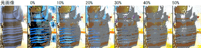 ![図2 DNNモデルの機械学習[4]時にブルー・バイアス画像を混ぜて比率を変えたモデルに対し、#TheDress画像でテストした結果の例。左から、元画像(入力画像)と、ブルー・バイアス画像の比率が0%〜50%の場合の出力例。図の上のパーセントの値が増えると、青/黒から白/金へと変化している。実際は、同じ条件で10回繰り返してDNNモデルを作成し評価している。](/attachments/SgxpgpH9qGS1bx1C4dak.png)