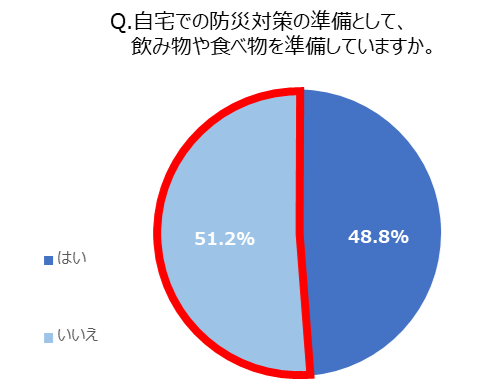 地震や台風、ゲリラ豪雨など自然災害の多い日本。自宅での防災対策として、飲み物や食べ物を準備しているか伺ったところ、日ごろから飲食料品を備えているのは2人に1人という結果に。