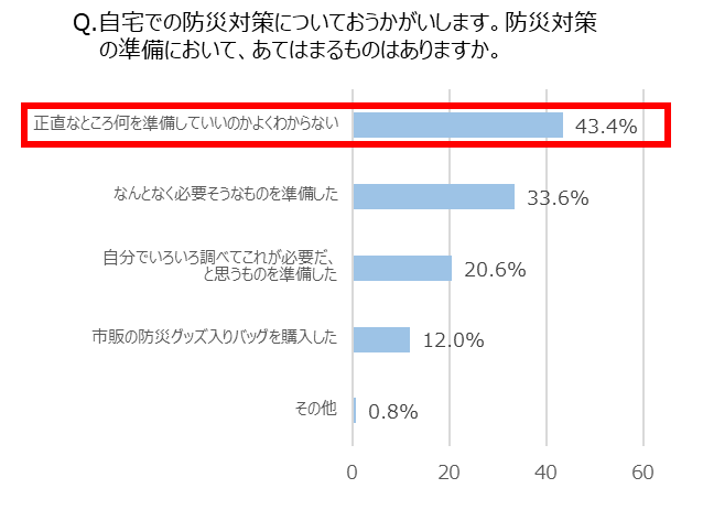 自宅での防災対策において、ママたちが参考にしていることや障壁になっていることは何でしょうか。「正直なところ何を準備していいのかよくわからない」(43.4%)、「なんとなく必要そうなものを準備した」(33.6%)と、防災の必要性は重々感じつつ、何からどう手をつけていいのかわからないという人が多いのかもしれません。