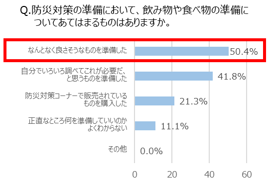 日ごろから防災対策として飲食料品を準備していると答えたママたちに選定の基準についてもお伺いしました。最も多かった回答は「なんとなく良さそうなものを準備した」(50.4%)という声です。