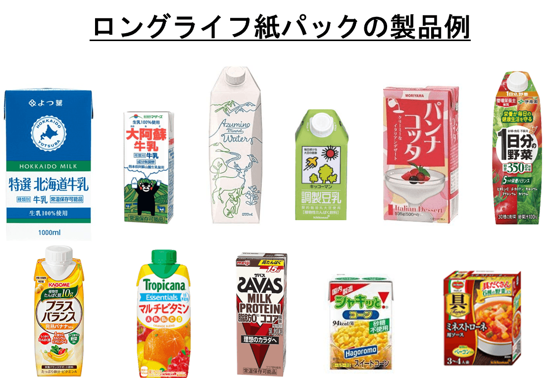 ロングライフ紙パックは、あまり聞きなれない名前ですが、実はほぼすべての人が一度は手にしたことがあるくらい、身近な紙パックです。野菜・果物ジュース、豆腐やパンナコッタなどの食品、牛乳・乳飲料、飲料水、コーヒーやお茶、栄養補助飲料、レトルト食品など、幅広い食品を包んでいます。