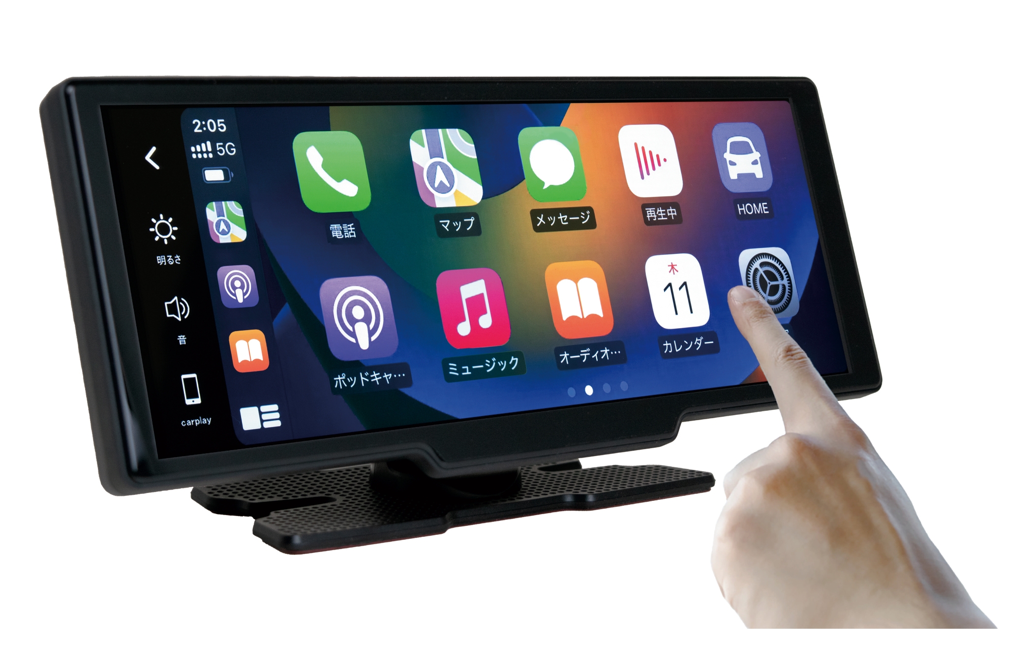iOS(Ver.10.0以降)、Android(Ver.12.0以降)の端末機器と、ホーム画面でメニューを選択していくことで簡単にワイヤレス接続を行なえます。取付は付属している両面テープタイプの専用のスタンドをダッシュボードに設置し、シガー電源アダプターを車のシガーソケットに接続するだけで簡単に取付が可能です。視認性に優れた10.26インチのIPS液晶を搭載し、タッチスクリーンでスムーズな操作がおこなえます。