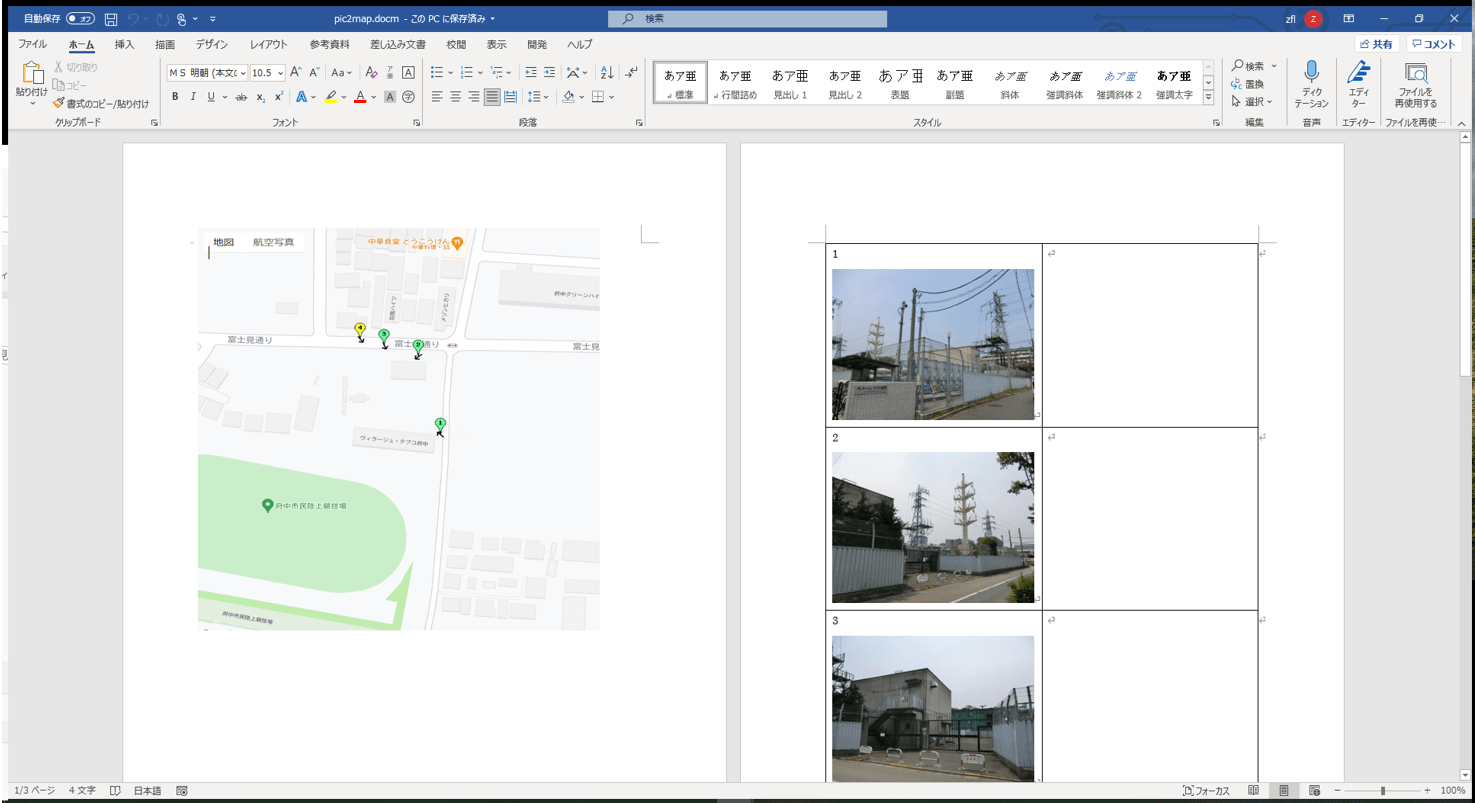 これらのフォーマットや出力項目は、インストール時に付属するWordのテンプレートファイルの中身次第で変更できます。インストール時に付属するWordのテンプレートファイルは、pic2map.docmとpic2map.docです。このテンプレートファイルを書き換えるだけで、出力内容を変更できます。