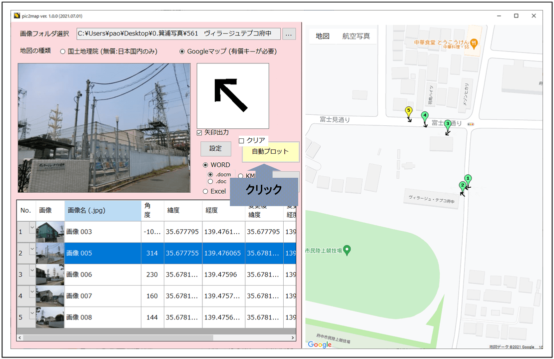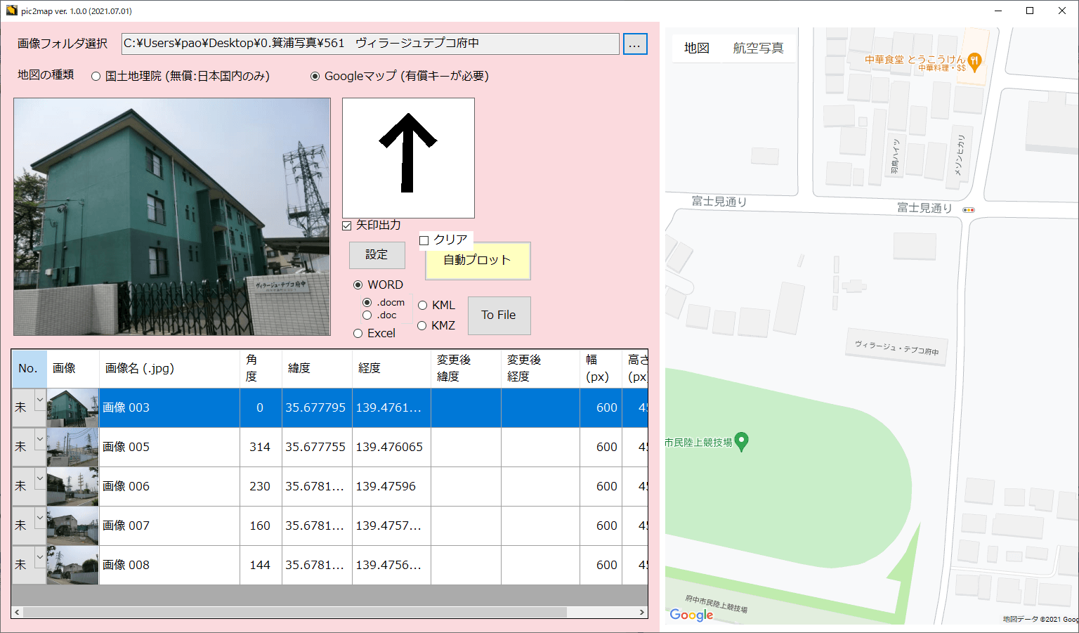 スマホやデジカメの写真を パソコンの地図上撮影地点に撮影方向矢印でプロット! 写真to地図アプリ「pic2map ver 2.0」新版リリース ~Google Earth(KML)/Word/Excelのファイルへ出力~