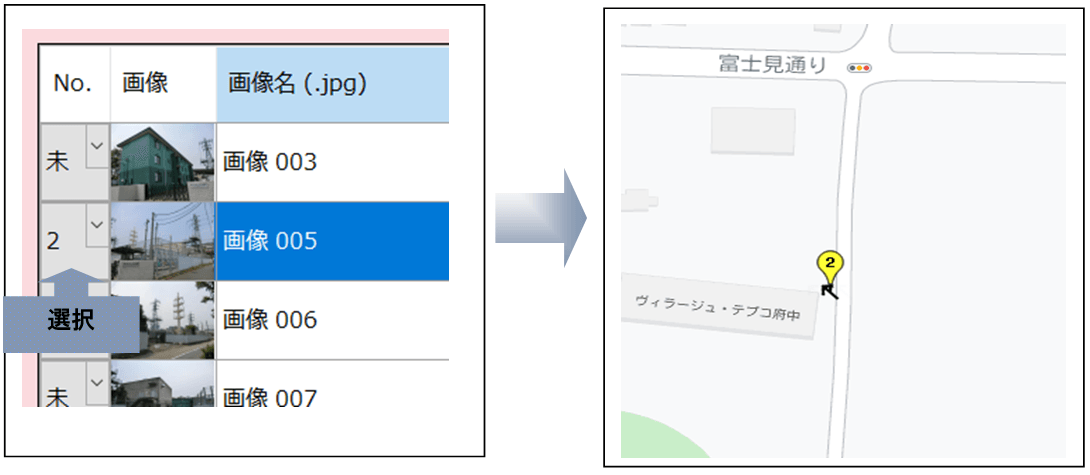 (4) ここで「No.」を選択すると、地図上のその画像を撮影した場所に撮影方向を矢印でプロットします。