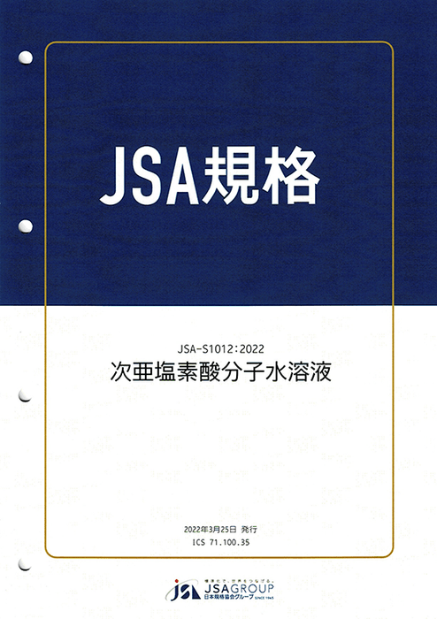 JSA規格「JSA-S1012:2022次亜塩素酸分子水溶液」は、次亜塩素酸水の品質と安全性に関する基準を定めています。この規格に準拠して製造された次亜塩素酸水は、その品質と安全性が確保されていることが保証されます。この規格は、次亜塩素酸水の製造業者だけでなく、それを利用する消費者にとっても信頼できるガイドラインとなっています。