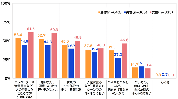 また、3位以降についてもみると、3位は「衣類のワキ部分の汗による黄ばみ」で45.0%、4位は「人前に出るなど、緊張するシーンでの汗・汗のにおい」で37.8%、5位は「つり革をつかむなど、腕をあげるときの汗ジミ」で37.3%、6位は「辛いもの、熱いものを食べた時の汗・汗のにおい」で14.7%でした。