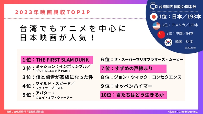 台湾の映画市場は興行収入、動員数共に年々堅調に推移しています。中でも日本映画の人気が高く、2023年に台湾国内で公開された映画作品数は日本作品が第1位(※)、国別公開作品の興行収入はアメリカに次いで日本が第2位となりました。また、2023年の年間興収ランキングでは、日本のアニメ『THE FIRST SLAM DUNK』が第1位を記録。その他、『すずめの戸締まり』、『君たちはどう生きるか』もTOP10入りする大ヒットとなりました。