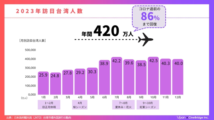 台湾からの訪日観光需要が急速に回復し、消費額は過去最高の7,786億円を記録し、今後も台湾からの観光客の増加が見込まれます。