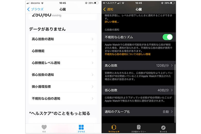 iPhoneの『ヘルスケアアプリ』→下部「ブラウズ」タブ→「心臓」から、「高心拍数の通知」や「低心拍数の通知」なども設定可能。