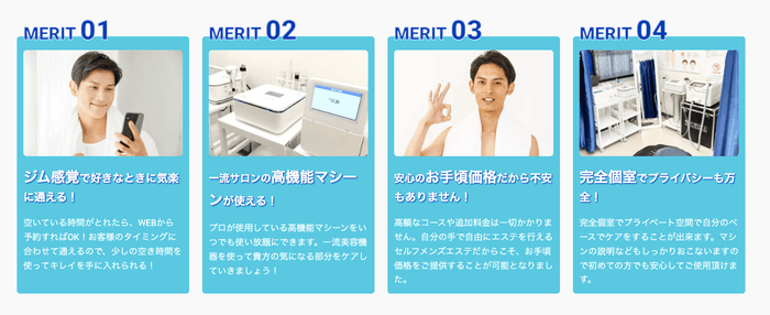 自分が引き締めたいところのみを優先して進めていくことも可能です。セルフ利用ですと、見られたくない箇所を個室で行うことができるため、痩身を始めたいけどスタッフに身体をみられることをハードルに感じ来店に一歩踏み出せない方を他店と差別化をしながらセルフ痩身でご利用して頂きやすい店舗へとなります。