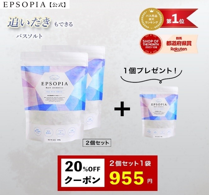 エプソピア楽天市場店では上記のキャンペーンに合わせ『エプソピア』の2個セットを購入いただいたお客様には、なんとプラスでもう1個『エプソピア』をプレゼント!さらに、20%OFFクーポンも配布します。