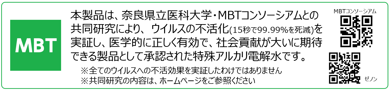 株式会社ゼノン(本社:東京都中野区/代表取締役社長:阿部 昭典)は、2021年4月、公立大学法人奈良県立医科大学及び一般社団法人MBTコンソーシアムとの共同研究において、「ZENON 特殊アルカリ電解水」が、新型コロナウイルス(SARS-CoV-2)の不活効果<※>を実証したことを受け、上記団体から、医学的に正しく、社会貢献が大きく期待される製品として、MBTロゴマークの製品への使用が2022年1月許諾されました。同社では、サスティナブルな社会への貢献を目指す上で、<独自技術で生成した特殊アルカリ電解水のポテンシャル>を、共通の理念を持つMBTコンソーシアムの会員企業などに積極的に情報発信し、産官学や産産における共同開発や製品化を図り、国内外の企業や家庭における「新たなソリューション」として提供していきたいと考えています。