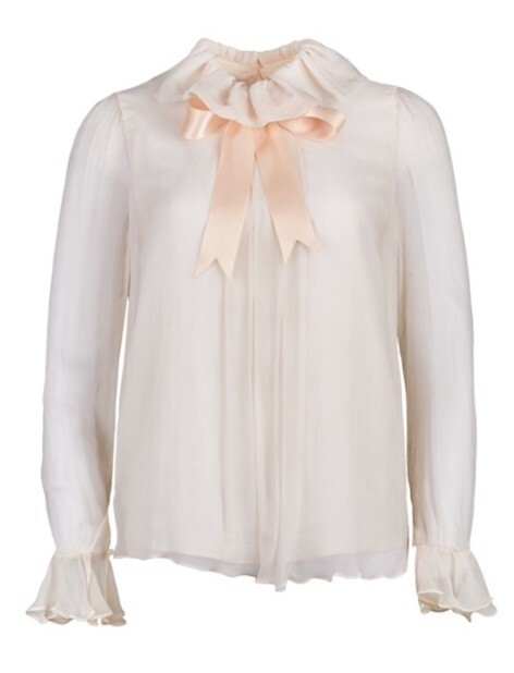 フリルが付いた襟と前部の緩いプリーツが特徴の淡いピンクのクレープブラウスは、後にダイアナ妃のウエディングドレスを手掛けたことで有名な、デザイナーのデイヴィッド・エマニュエルとエリザベス・エマニュエル夫妻によって制作されました。ダイアナ妃は、用意されたさまざまな洋服の中から、このブラウスを見るなり一目ぼれして、誰が作ったのかと尋ね、そこからエマニュエル夫妻に問い合わせが来たそうです。
