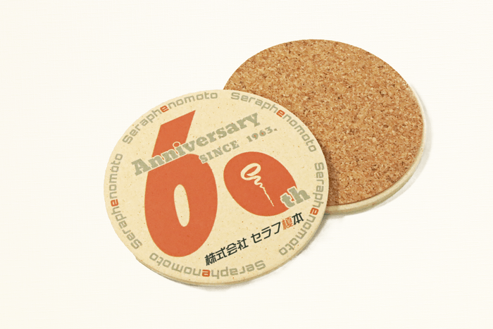 珪藻土で作られたセラフ榎本創業60周年を記念したデザインのコースター。多孔質な珪藻土の特徴を生かし、コップから落ちる水滴を瞬時に吸水するため常にコースターの表面がサラサラで快適です。