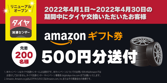 ■概要 タイヤ流通センター公式WEBサイトにて、タイヤ交換予約をしてくださったお客様先着200名様にAmazonギフト券500円分をプレゼント