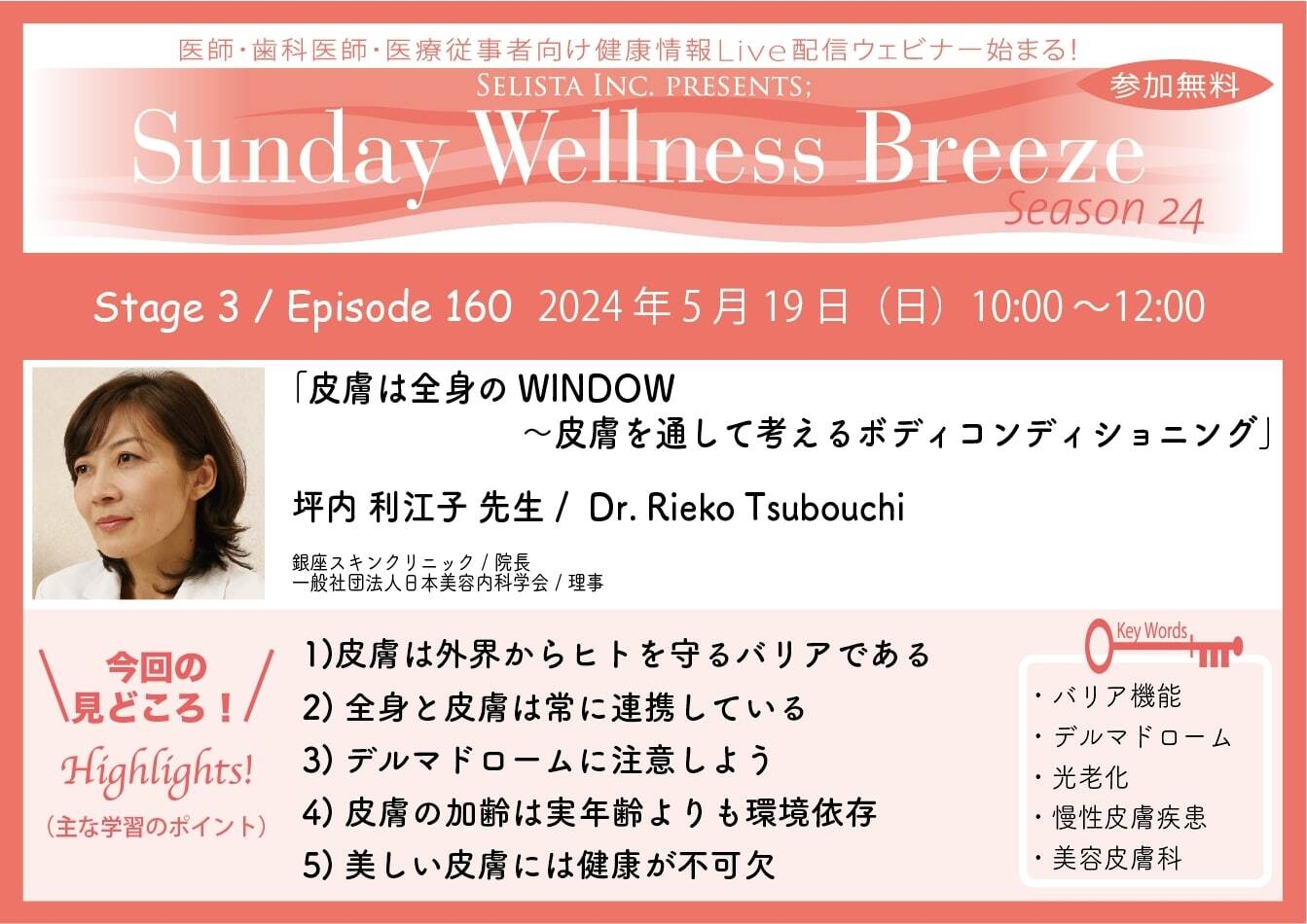 《医師・歯科医師・薬剤師向け》 無料オンラインセミナー5月19日(日)朝10時開催 『皮膚は全身のWINDOW~ 皮膚を通して考えるボディコンディショニング』 講師:坪内 利江子 先生(銀座スキンクリニック/院長)