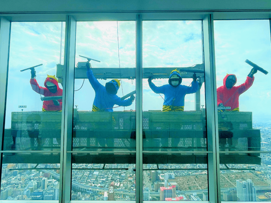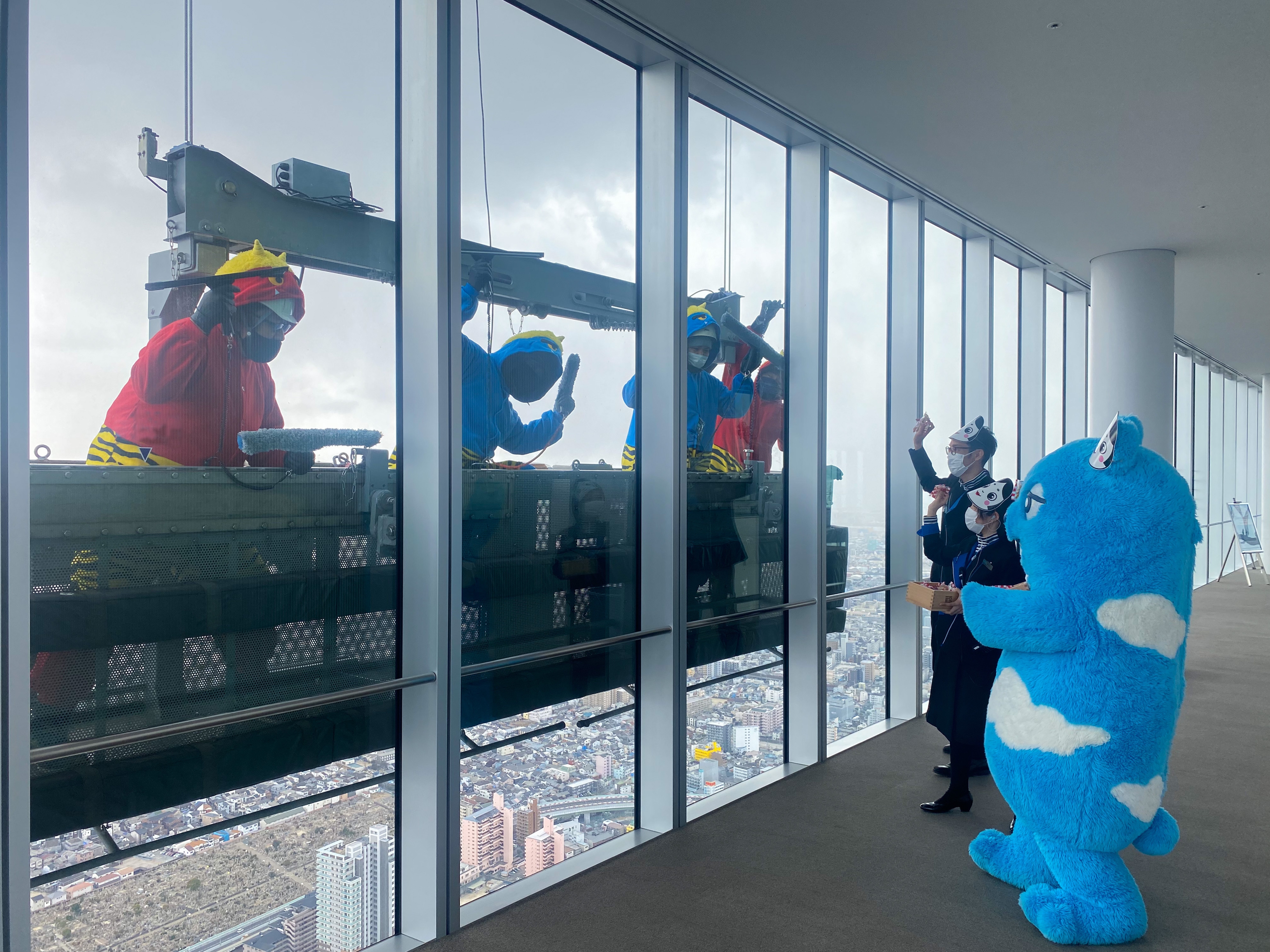 あべのハルカスでは、いつでもお客さまに美しい景色をご覧いただくため、定期的に外壁ガラスの清掃を行っています。例年12月は、サンタクロースやトナカイに扮した作業員が登場しますが、クリスマス以外にも登場してほしいというお客さまからのリクエストを受けて、昨年から節分にちなんで赤オニや青オニが登場しています。