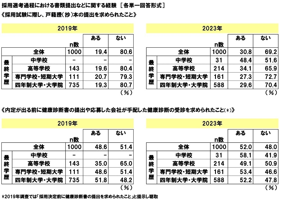 職業安定法では、社会的差別の原因となるおそれのある個人情報などの収集が原則として禁止されており、採用選考時に戸籍謄(抄)本の提出を求めることや、合理的な理由なく一律的に健康診断書の提出を求めたり健康診断を実施したりすることは認められていません。ルールを順守せず、応募者に対しこれらの書類の提出を求めたり、健康診断の受診を求めたりしているケースが増えている実状が明らかとなりました。戸籍謄(抄)本提出を求められたケースは前回より10ポイント以上増え、内定前の健康診断の実施も依然として半数程度となっており、採用側の意識の改善が求められます。